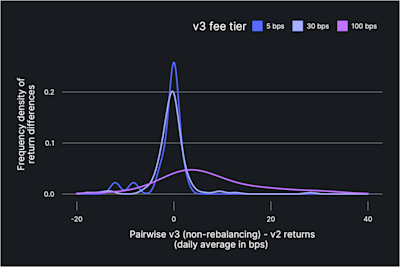 Table 1 shows the summary statistics of the return differentials. The mean pairwise difference in daily returns across all fee-tiers is 4.4 bps, indicating that v3 pools outperform the corresponding v2 pools in annualized returns by around 16% (4.4 bps x 365 days) on average. For token pairs in the 100-bps fee-tier on v3, the average and median pairwise fee return differences are around 10.2 bps (36.5% annualized) and 4.9 bps (17.9% annualized), respectively. This indicates that users with non-rebalancing positions on v3 benefit from the higher fee-tiers and volume in Uniswap v3 despite not actively managing concentrated liquidity positions.
